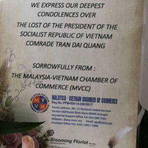 A wreath from MVCC is delivered to Vietnam Embassy for the Lost of their President Late Mr Tran Dai Guang – MVCC EXCO signed the condolences memorial on 27 Sept 2018